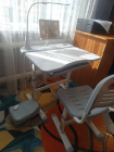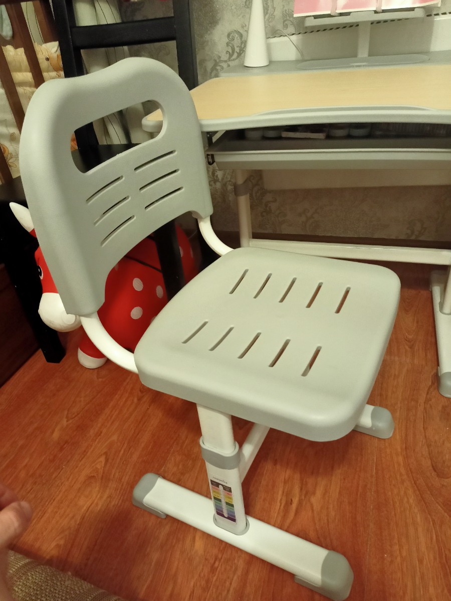 Стул, идущий в комплекте, также как и стол регулируется по высоте с помощью ступенчатого механизма. На ножке есть ростовая шкала-подсказка с соотношением роста ребенка и высоты самого стула. Также сиденье и спинка выполнены со специальной перфорацией, чтобы ребенку было комфортно переносить жаркое время года, а специальная ручка поможет легко перенести стульчик по комнате.